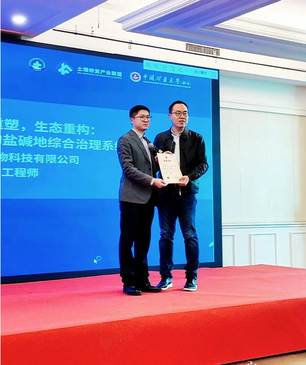 中國科學(xué)院大學(xué)教授,博士生導(dǎo)師劉建明認(rèn)可點(diǎn)評(píng) 此外,清華環(huán)境研究院韓建鈞博士也為河南中原農(nóng)谷生物科技有限公司現(xiàn)場(chǎng)頒獎(jiǎng),這份來自權(quán)威專家與行業(yè)平臺(tái)的雙重認(rèn)可,充分印證了企業(yè)在鹽堿地治理領(lǐng)域的核心競(jìng)爭(zhēng)力。 ![]() 清華環(huán)境研究院韓建鈞博士頒獎(jiǎng) 本次參會(huì)是中原農(nóng)谷&金谷生物鏈接行業(yè)資源、展示技術(shù)實(shí)力的重要契機(jī),也為公司后續(xù)拓展鹽堿地治理等業(yè)務(wù)奠定了堅(jiān)實(shí)基礎(chǔ)。 未來,中原農(nóng)谷&金谷生物將繼續(xù)以技術(shù)創(chuàng)新為核心驅(qū)動(dòng)力,深耕鹽堿地綜合利用等關(guān)鍵領(lǐng)域,推動(dòng)更多優(yōu)質(zhì)技術(shù)與方案落地應(yīng)用,以實(shí)際行動(dòng)踐行生態(tài)保護(hù)使命,助力國家糧食安全,攜手行業(yè)伙伴共筑綠色生態(tài)發(fā)展新格局,為守護(hù)土地健康、賦能農(nóng)業(yè)高質(zhì)量發(fā)展貢獻(xiàn)更多力量! ![]()